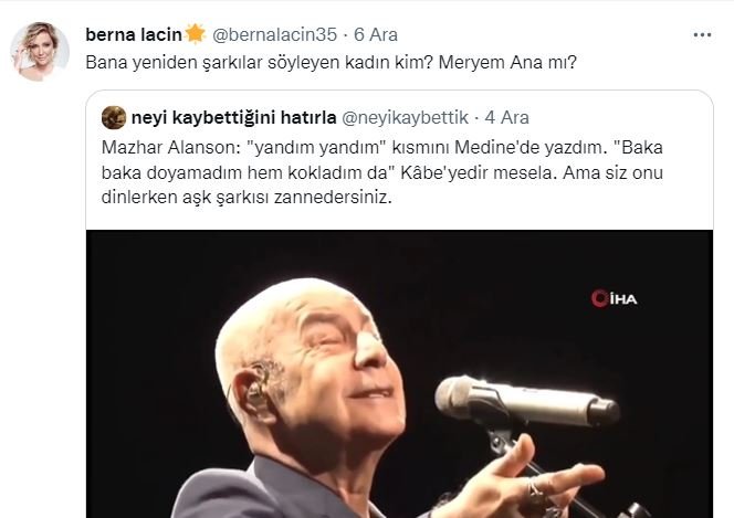 Mahzar Alanson 2018 yılında verdiği bir konser sırasında, ‘Yandım Yandım’ şarkısının aşk şarkısı olmadığını, Kabe’ye yazıldığını söylemişti. Mazhar Alanson’un yıllar önce yaptığı bu açıklamaya Berna Laçin Twitter'dan tepki gösterdi.