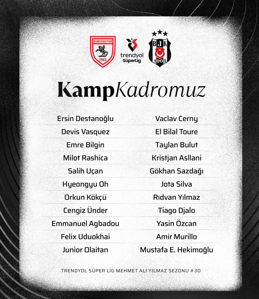 Trendyol Süper Lig'in 30. haftasında Samsunspor'a konuk olacak Beşiktaş'ın kamp kadrosu belli oldu.