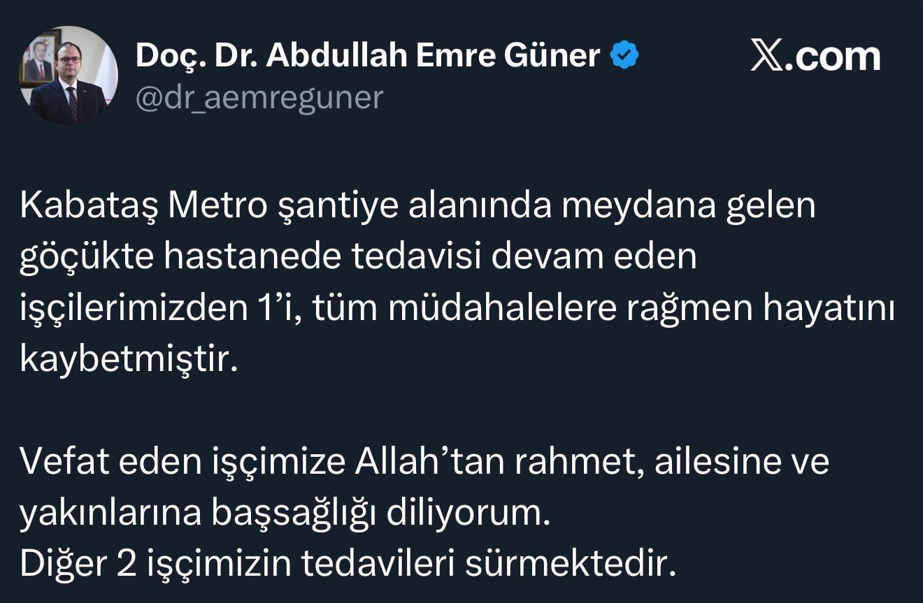 İstanbul İl Sağlık Müdürü Abdullah Emre Güner, Kabataş Metro şantiye alanında meydana gelen göçükte hastanede tedavisi devam eden işçilerden 1’inin tüm müdahalelere rağmen hayatını kaybettiğini açıkladı.