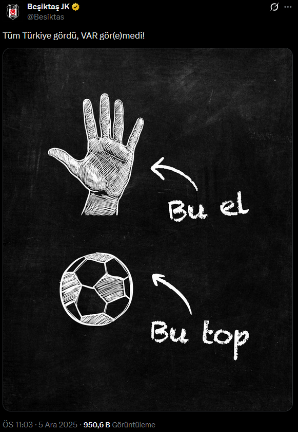 Siyah-beyazlı ekip sosyal medya hesabından el ve top görseli paylaşırken "Tüm Türkiye gördü, VAR gör(e)medi!" ifadelerini kullandı. Beşiktaş sezon başında VAR'da görev alan Onur Özütoprak'ı bir kez daha hedef almıştı.