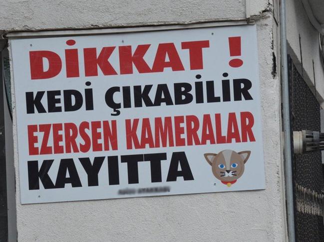 Gazipaşa Mahallesinde ayakkabı mağazası sahibi Emrah Aslan, sokağındaki çok sayıda kediyi besleyip, ihtiyaçlarını karşılıyor. Son dönemde sokaktan geçen araçların hızlı gittiğini ve 10 kedinin bu nedenle ezildiğini ifade eden Aslan, kendince çözüm üreterek yoldan görünecek şekilde iş yeri duvarına üzerinde "Dikkat! Kedi çıkabilir ezersen kameralar kayıtta" yazılı tabela astığını söyledi.