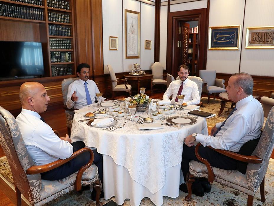 Cumhurbaşkanı Recep Tayyip Erdoğan, Cumhurbaşkanlığı Sarayı'nda Katar Emiri Şeyh Temim bin Hamed Al Sani ile çalışma yemeğinde bir araya geldi. Cumhurbaşkanlığı Külliyesi'nde basına kapalı gerçekleşen görüşme, yaklaşık 3 buçuk saat sürdü. Yemeğe Hazine ve Maliye Bakanı Berat Albayrak da katıldı. Zirvede son ekonomik gelişmeler başta olmak üzere, iki ülke arasındaki ilişkilerin masaya yatırıldığı öğrenildi.