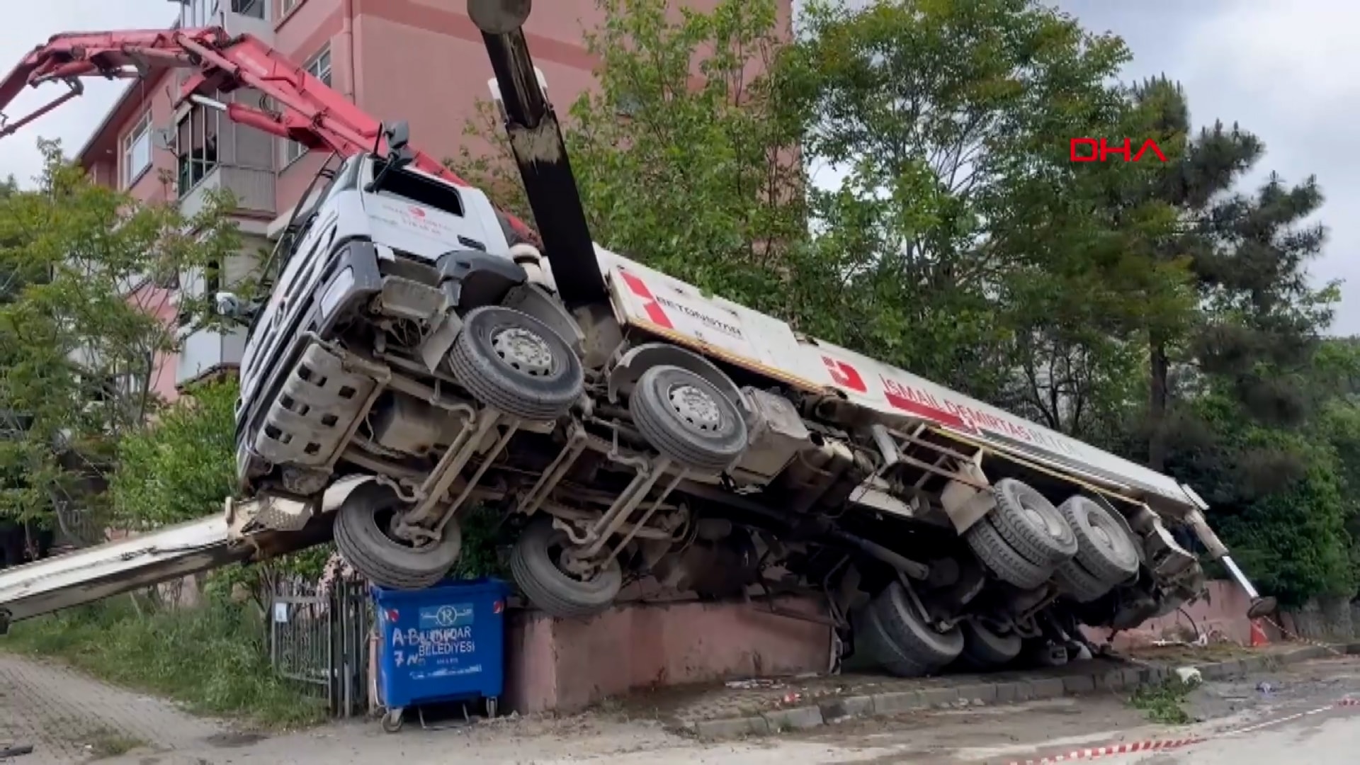 Beton mikseri pompası binanın 4. katında bulunan balkona çarptı. Balkonda hasar oluşurken polis ekipleri sokak üzerinde önlem aldı. Beton pompasının kaldırılması için vinç çağırıldı.