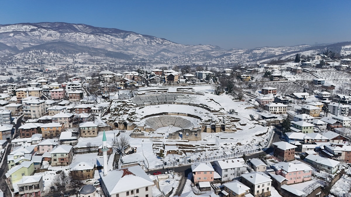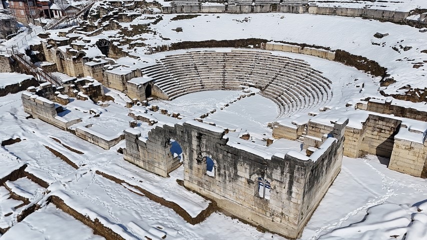Karla kaplı antik tiyatro dron ile görüntülendi.