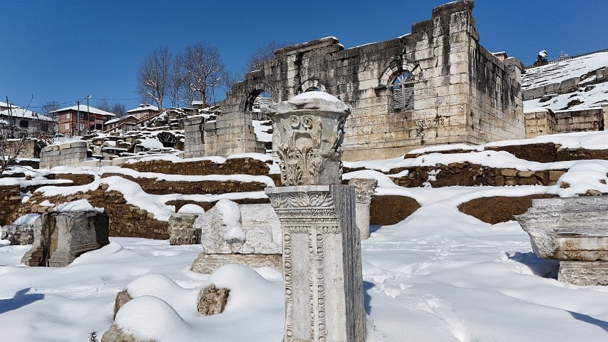 Düzce Belediyesi tarafından başlatılan kazılarla büyük bölümü ortaya çıkarılan, Roma ve önceki dönemlere ait eserler bulunan Konuralp Antik Tiyatrosu kar yağışı ile birlikte beyaza büründü.