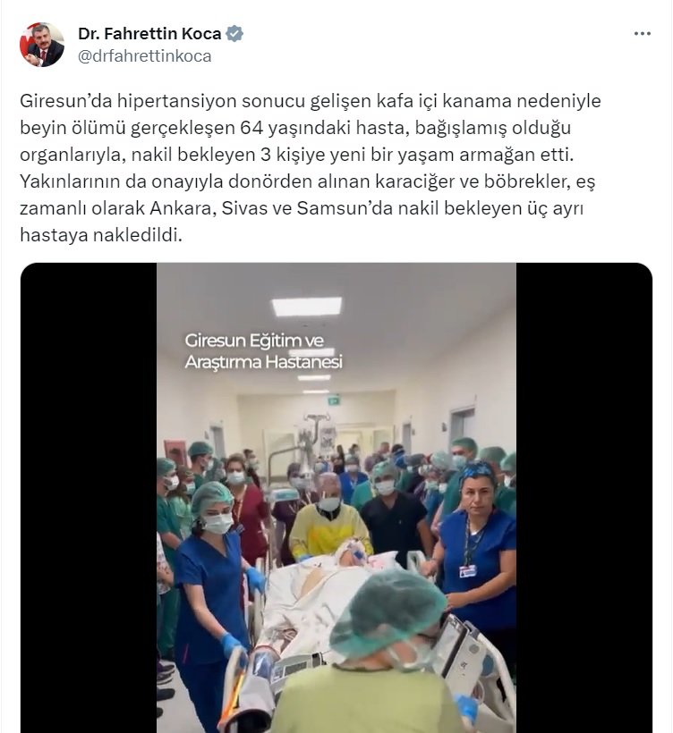 * Giresun'da hipertansiyon sonucu gelişen kafa içi kanama nedeniyle beyin ölümü gerçekleşen 64 yaşındaki hasta, bağışlamış olduğu organlarıyla, nakil bekleyen 3 kişiye yeni bir yaşam armağan etti.
