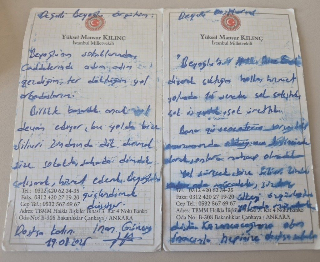 İnan Güney, CHP İstanbul Milletvekili Yüksel Mansur Kılınç aracılığı ile kamuoyuna ve CHP Beyoğlu örgütüne kendi el yazısı ile gönderdiği mesajla seslendi.