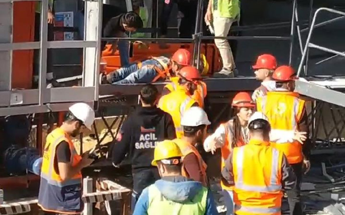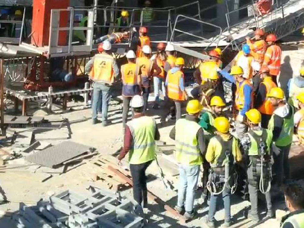 Asansör büyük bir gürültüyle çökerken 4 işçi hafif yaralandı. Diğer işçiler yaralı arkadaşlarının yardımına koştu.