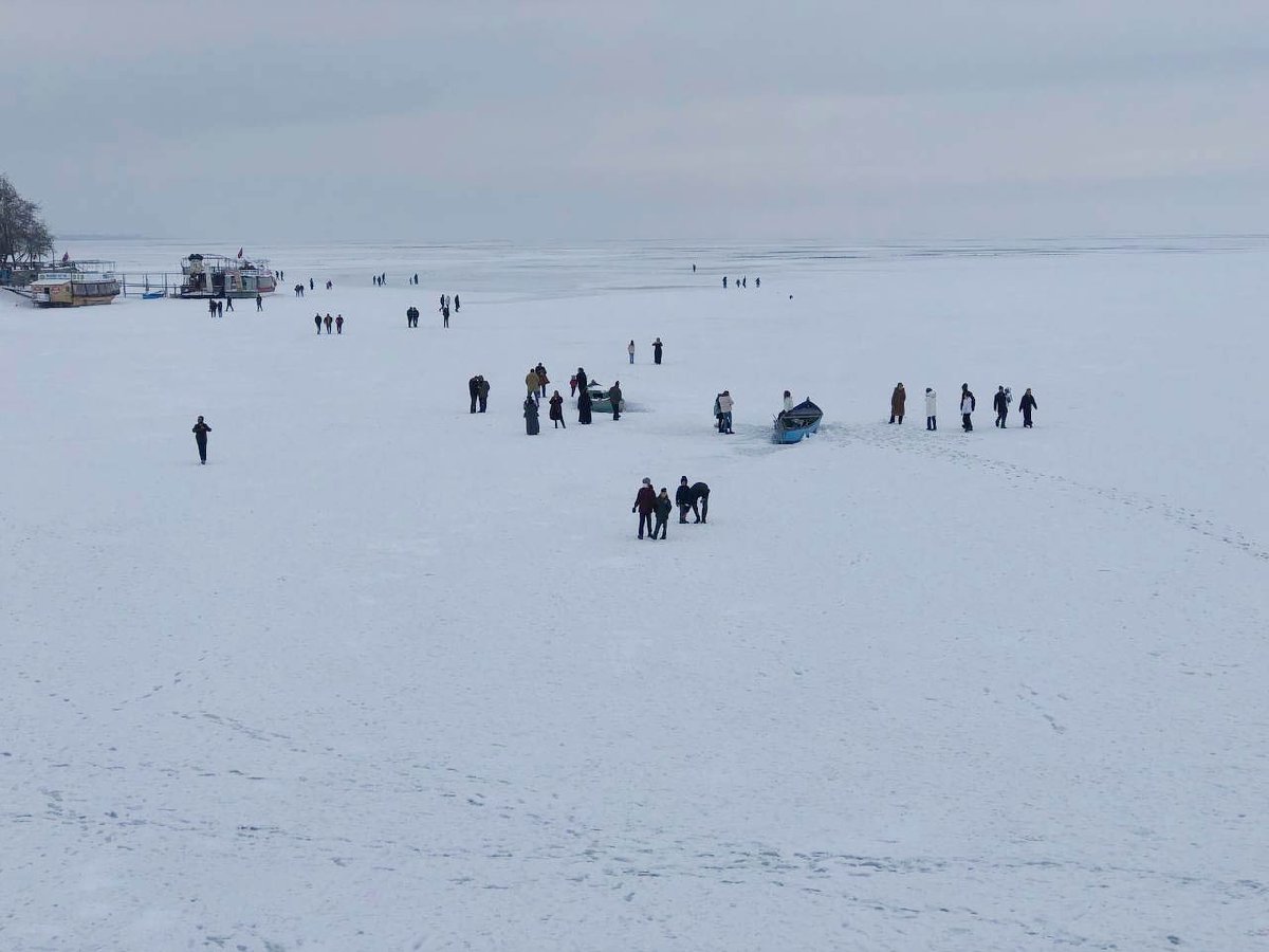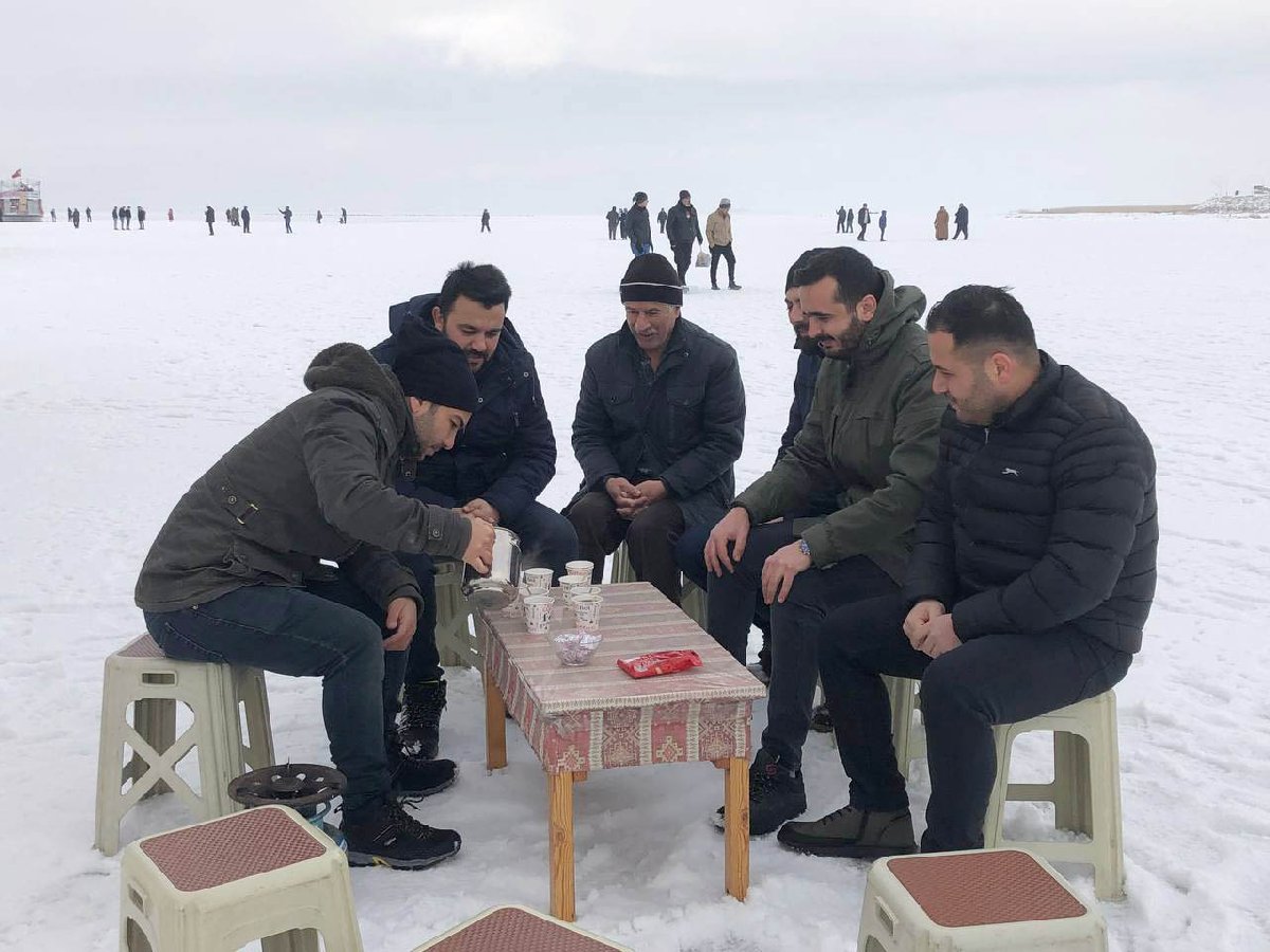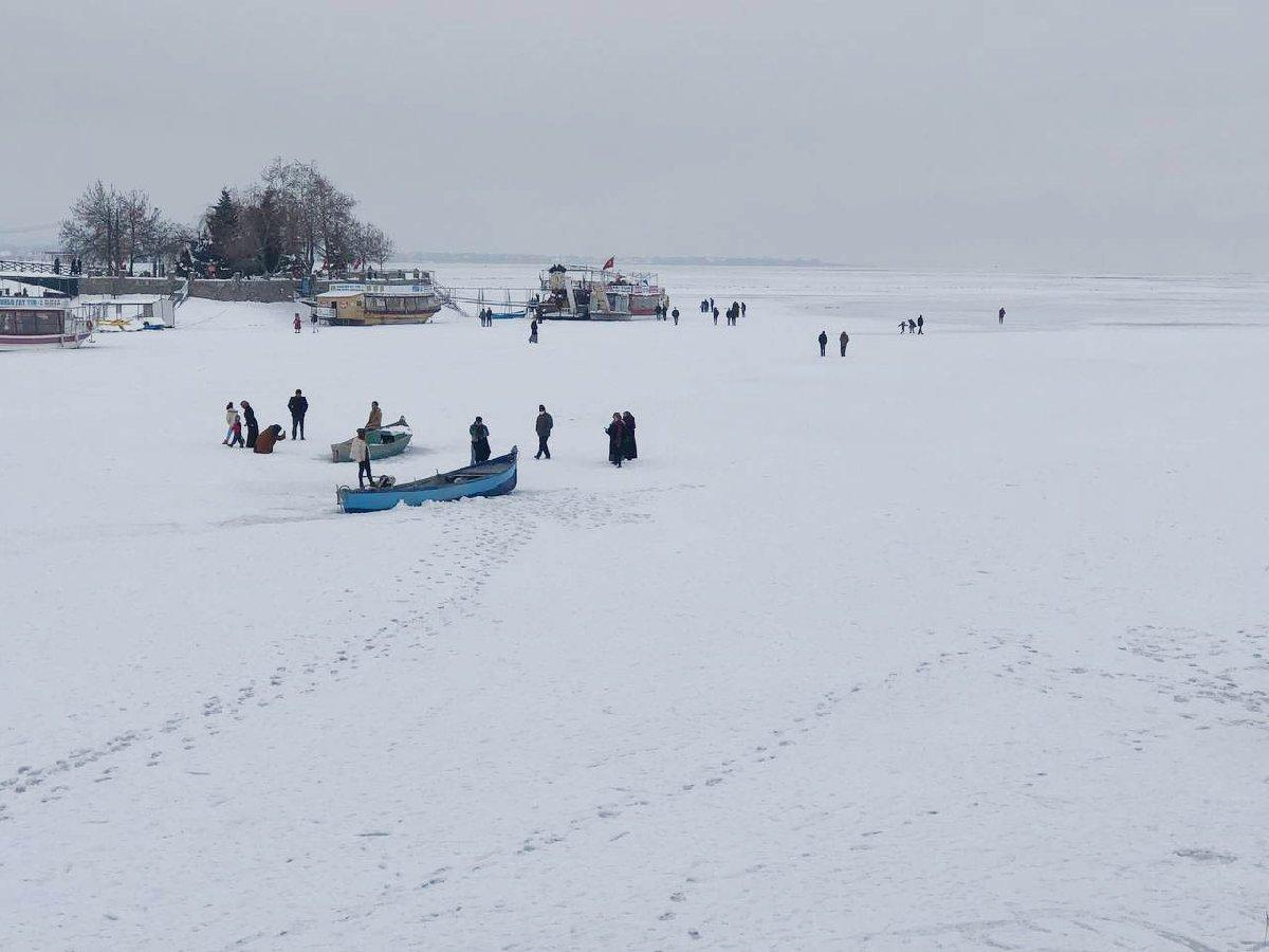 Kayık ve teknelerin açıldığı gölün üzerinde yürünmeye başlandı. Buz kütlesinin 40 santimetre olduğu değerlendirilirken, bazı kişiler, göl üzerinde yürüyüp, fotoğraflar çekti. Masa ve sandalye getirenler de buz tutan gölde oturup, çay içti.
