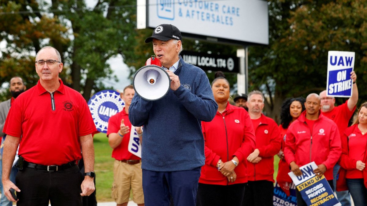 UAW üyesi olan General Motors çalışanlarının grev alanında megafonu eline alarak işçilere seslenen Biden, işçilerin yüzde 40’lık maaş zammı talebine destek verdiğini ve “çok daha fazlasını” hak ettiklerini söyledi.