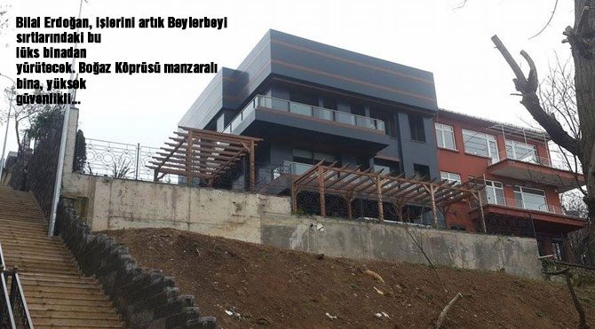Cumhurbaşkanı Tayyip Erdoğan’ın oğlu Bilal Erdoğan, denizcilik şirketlerini yeni bir ofise taşıdı. Beylerbeyi Mahallesi, Yalıboyu Caddesi’nde üç parselden oluşan alanı satın alan Bilal Erdoğan, bir parsele dört katlı şirket binasını inşa ettirdi. 2.5 dönüme yakın arazi üzerine kurulan binanın arsa ve inşaat maliyetinin yaklaşık 340 milyon lira olduğu tahmin ediliyor. Şirket binası Boğaz Köprüsü manzarasına sahip... Diğer iki parselden biri otopark, biri de güvenlik amacıyla bahçe haline getirildi.