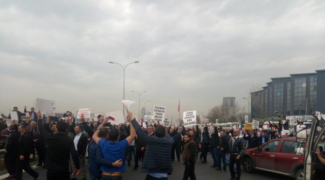 Ellerinde kırmızı kart taşıyan ve oturma eylemi yapan kalabalık saat 11:00'de slogan atarak D-100 Karayolu'na çıktı. Kalabalığa polis engel olamadı. Servisçiler yolu çift yönlü olarak trafiğe kapattı.