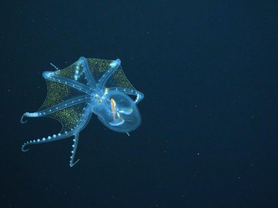 Falkor araştırma gemisiyle yapılan seferde 30 bin kilometre karelik okyanus tabanını haritalayan bilim insanları, tek görünür özellikleri optik siniri, göz küreleri ve sindirim sistemi olan neredeyse şeffaf cam ahtapotun iki nadir görüntüsünü yakaladı.