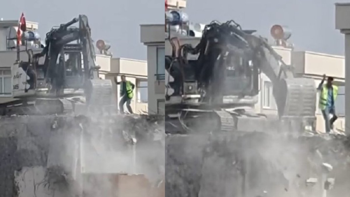 Yıkım sırasında bir işçinin iş makinesinin yanında dans etmesi dikkat çekti. Bu anlar cep telefonu kamerasıyla kaydedilirken, çevreye yayılan toz bulutu da tepkilere neden oldu. (DHA)