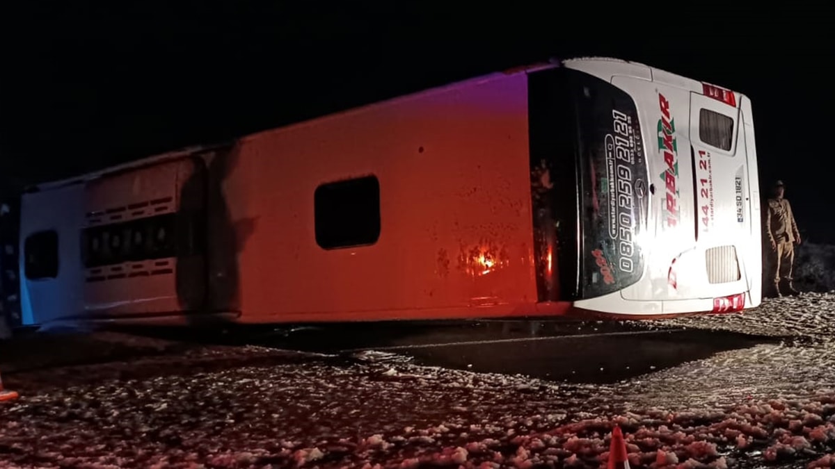 Bingöl'ün Karlıova ilçesine bağlı Azizan Köyü mevkisinde 34 SD 1821 plakalı yolcu otobüsü, kar yağışının etkili olduğu bölgede kontrolden çıkarak devrildi.