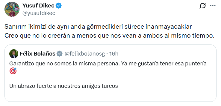 İspanya’da bir sosyal medya kullanıcısının Bakan Bolaños’u milli atıcı Yusuf Dikeç’e benzetmesi sonrası paylaşımı alıntılayan Bolaños, “Aynı kişi olmadığımızın garantisini veriyorum” dedi.