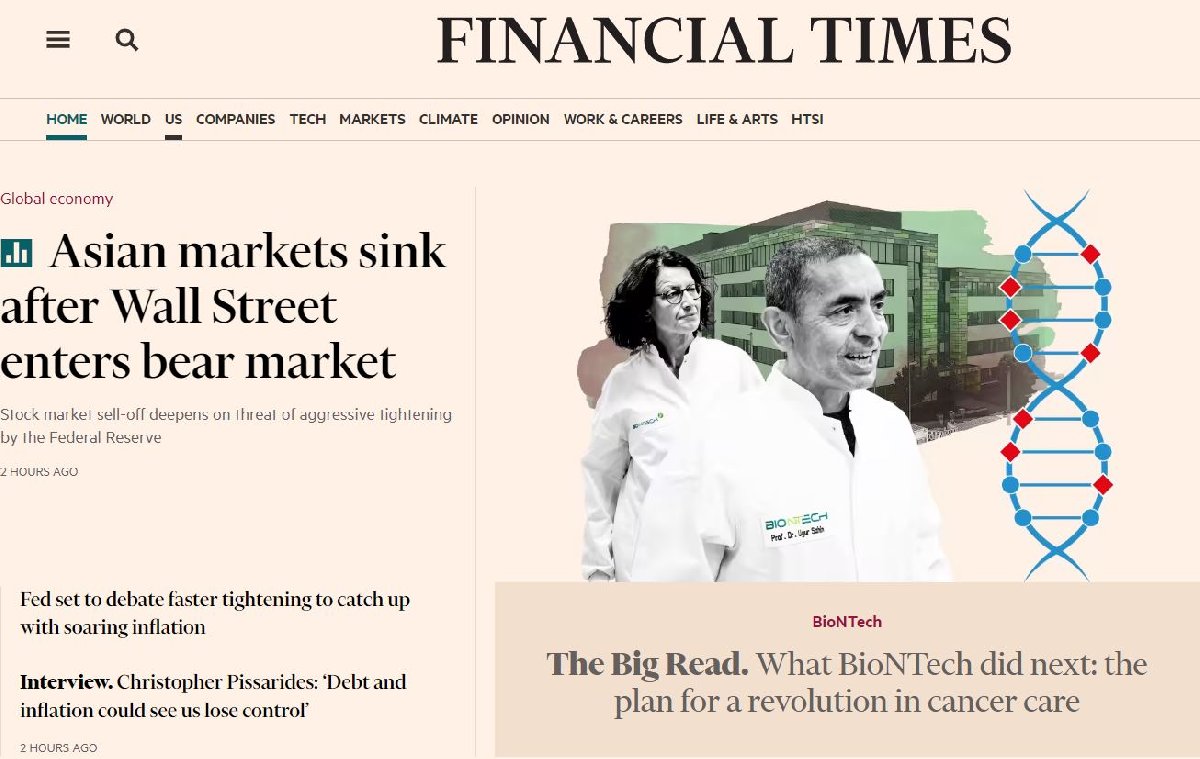 Financial Times, BioNTech ile ilgili kapsamlı bir analiz hazırladı.Financial Times, "Bazı milyarderler servetleriyle gazete satın alır ya da uzaya gitme hayali kurar fakat Şahin ve Türeci'nin önceliği onkoloji. Şahin, her kanser hastasına özel ilaç geliştirmek istediğini itiraf etti" yorumuna yer verdi. Şirketin iki ilaç için çalışmalara devam ettiğini aktaran gazete, "Bunlardan biri pankreas kanseri diğeri de yumurtalık kanseri ile ilgili" ifadesine yer verdi.