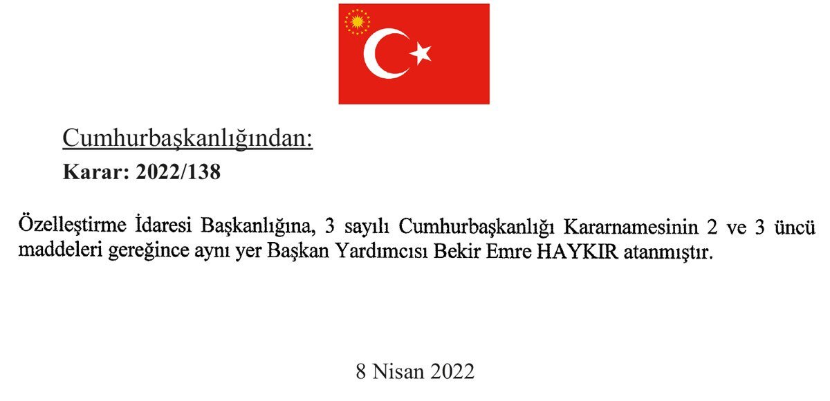 Resmi Gazete'nin bugünkü sayısında Cumhurbaşkanı Recep Tayyip Erdoğan'ın imzasıyla yayımlanan Atama Kararlarına göre, Özelleştirme İdaresi Başkanlığına, Başkan Yardımcısı Bekir Emre Haykır atandı.