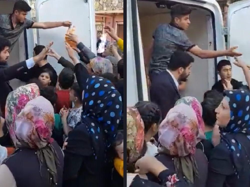 Görüntülerde bazılarının kucağında çocukları olan kadınlar, içecekten alabilmek için yoğun mücadele veriyor. Dağıtımı yapan kişinin bir kadına, ‘Sana yok. Sana yok. Bu nasıl bir ahlaksızlık ya?” diye çıkışması dikkat çekti.