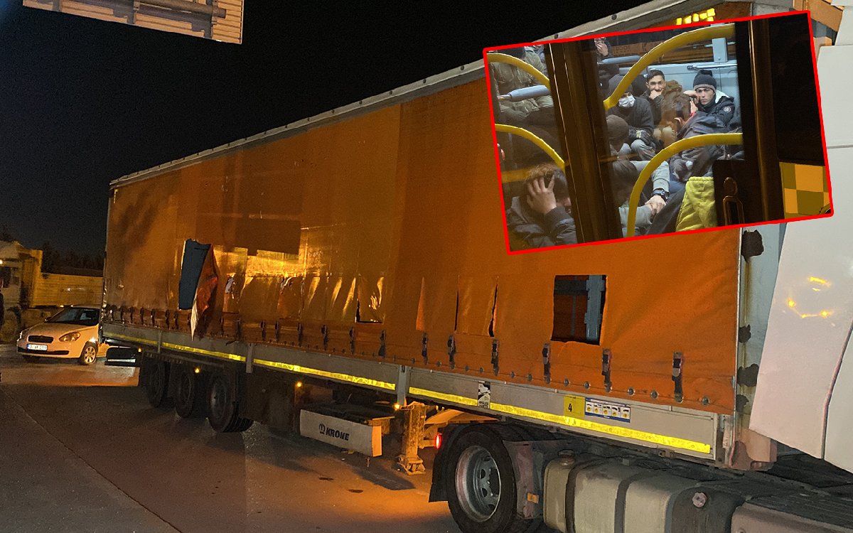 Polis ekiplerince yapılan aramada, TIR'ın brandayla kapalı olan dorsesinde bulunan çok sayıda kaçak göçmen olduğu belirlendi.