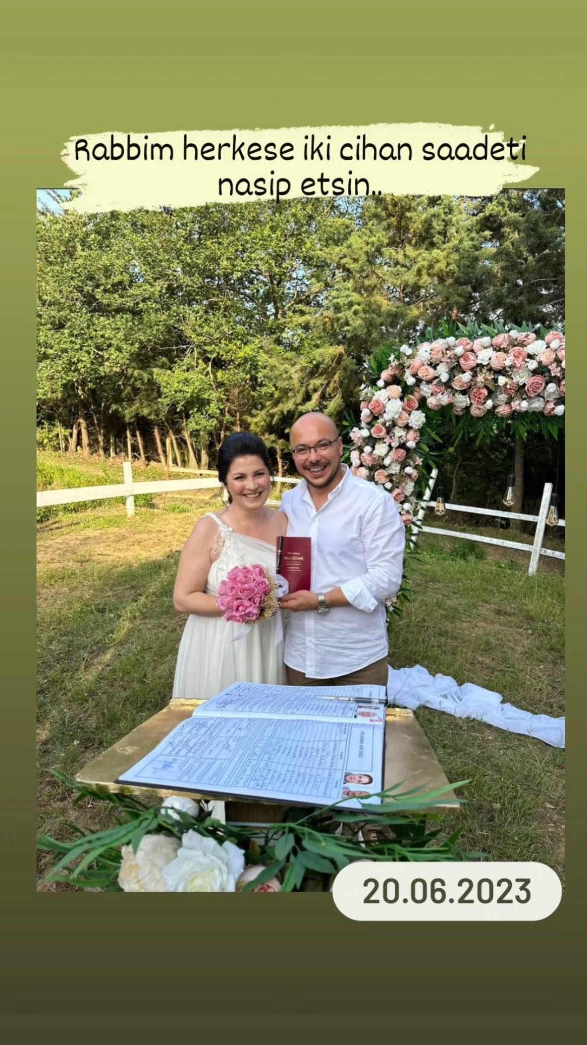 Ayşe Birsen Şen de kendi sayfasından paylaştığı nikâh pozuna ''Rabbim herkese iki cihan saadeti nasip etsin'' notunu düştü.