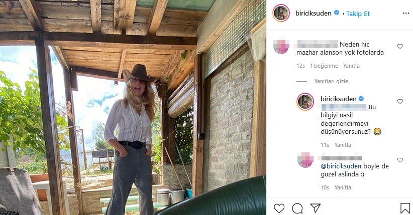 Kendisine yapılan bu yorumu yanıtsız bırakmayan Biricik Suden, paylaşımlarında neden eşinin fotoğraflarına yer vermediğini "Bu bilgiyi nasıl değerlendirmeyi düşünüyorsunuz?" yanıtıyla açıklamayı tercih etti.