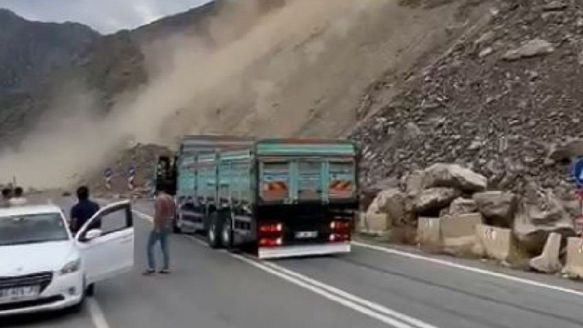 Artvin'in Yusufeli içesinde yamaçtan kopan taş, toprak ve kaya parçaları kara yoluna aktı. Heyelan anı, cep telefonu kamerasıyla görüntülendi.