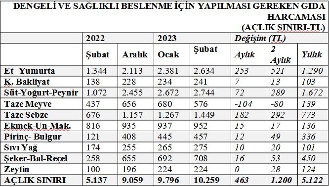 Buna göre, dört kişilik bir ailenin mutfak alışverişini kapsayan açlık sınırı, şubatta bir önceki aya göre 463 lira artarak 10 bin 259 TL'ye çıktı.