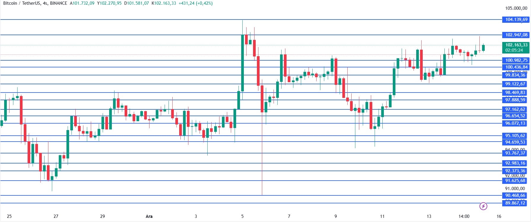 Dünü 100 bin 609 dolar ile 102 bin 649 dolar aralığında geçiren Bitcoin, günü 101 bin 442 dolardan tamamladı. Yeni günde ise sabah seansında saat 12.50'de 102 bin 176 dolar eviyesinde bulunuyor.