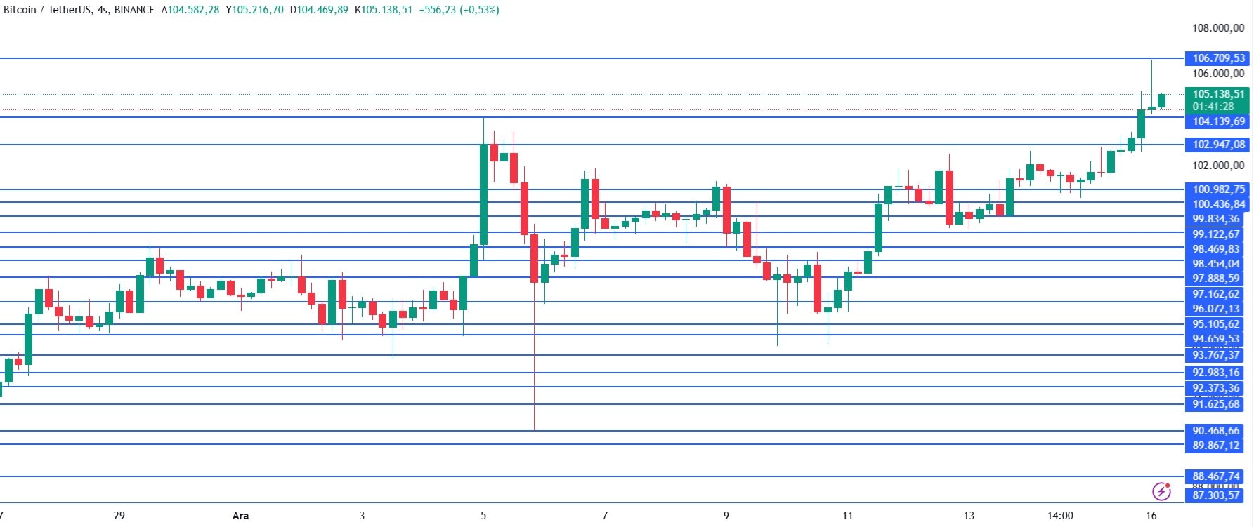 Dünü 101 bin 251 dolar ile 105 bin 243 dolar aralığında geçiren Bitcoin günü 104 bin 458 dolardan tamamladı. Yeni güne başlarken ise gece seansında 106 bin 676 dolara yükselerek yeni bir rekor kırdı. Sabah seansında ise 09.12'de 105 bin 156 dolarda yükselişini sürdürüyor.