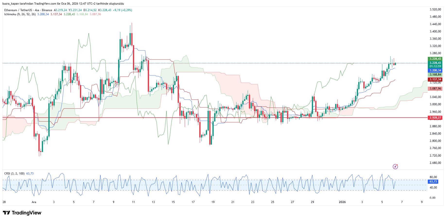 Altcoinler grubunun en büyüğü olan Ethereum'da da yatay bir seyrin olduğu görülüyor. Ethereum, haftanın ikinci işlem gününde öğlen seansında 13.44'te 3 bin 200 dolarda bulunuyor.