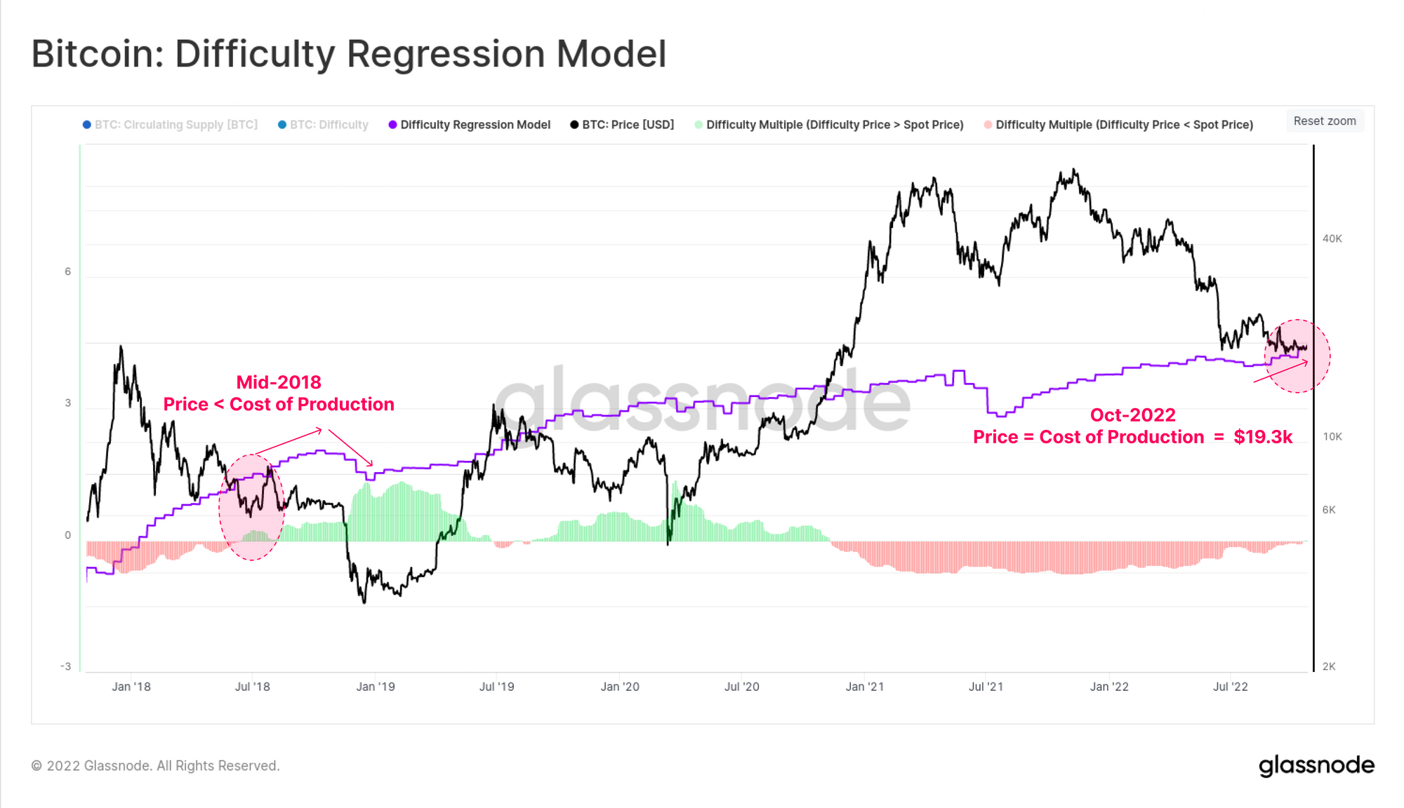 Madencilik zorluğunun değişkenlerini dikkate alarak ortalama maliyeti hesaplayan Zorluk Regresyon Modeli'ne göre Bitcoin üretim maliyeti geçtiğimiz haftalarda Bitcoin'in halihazırdaki değerine yakınlaştı.
