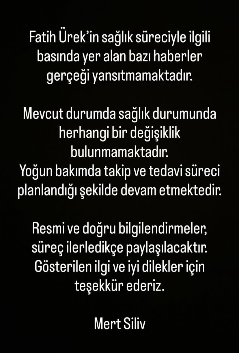 Konuyla ilgili Fatih Ürek'in menajeri Mert Siliv açıklama yaptı. Siliv, Ürek'in bitkisel hayatta olmadığını ve durumunun stabil olduğunu açıkladı.