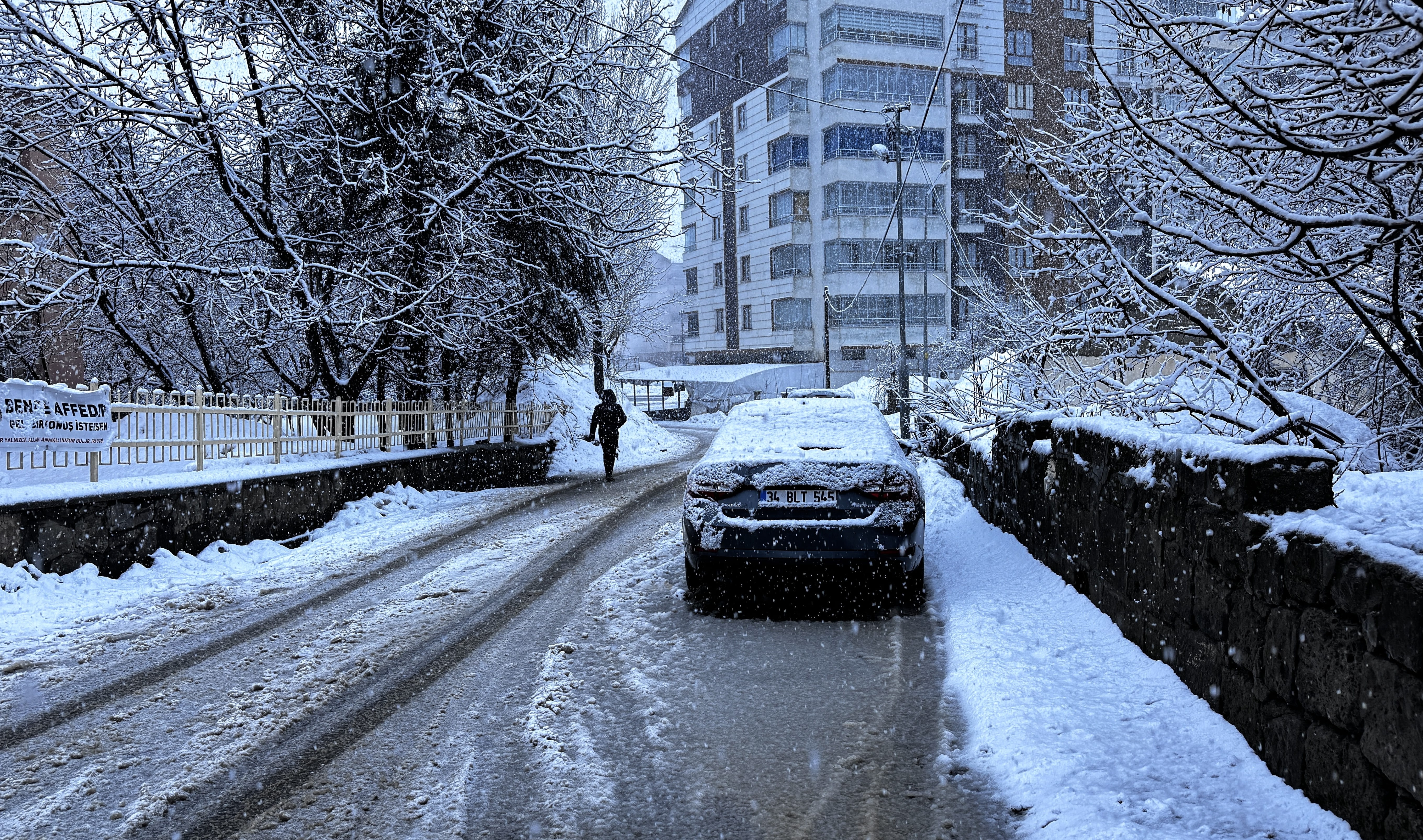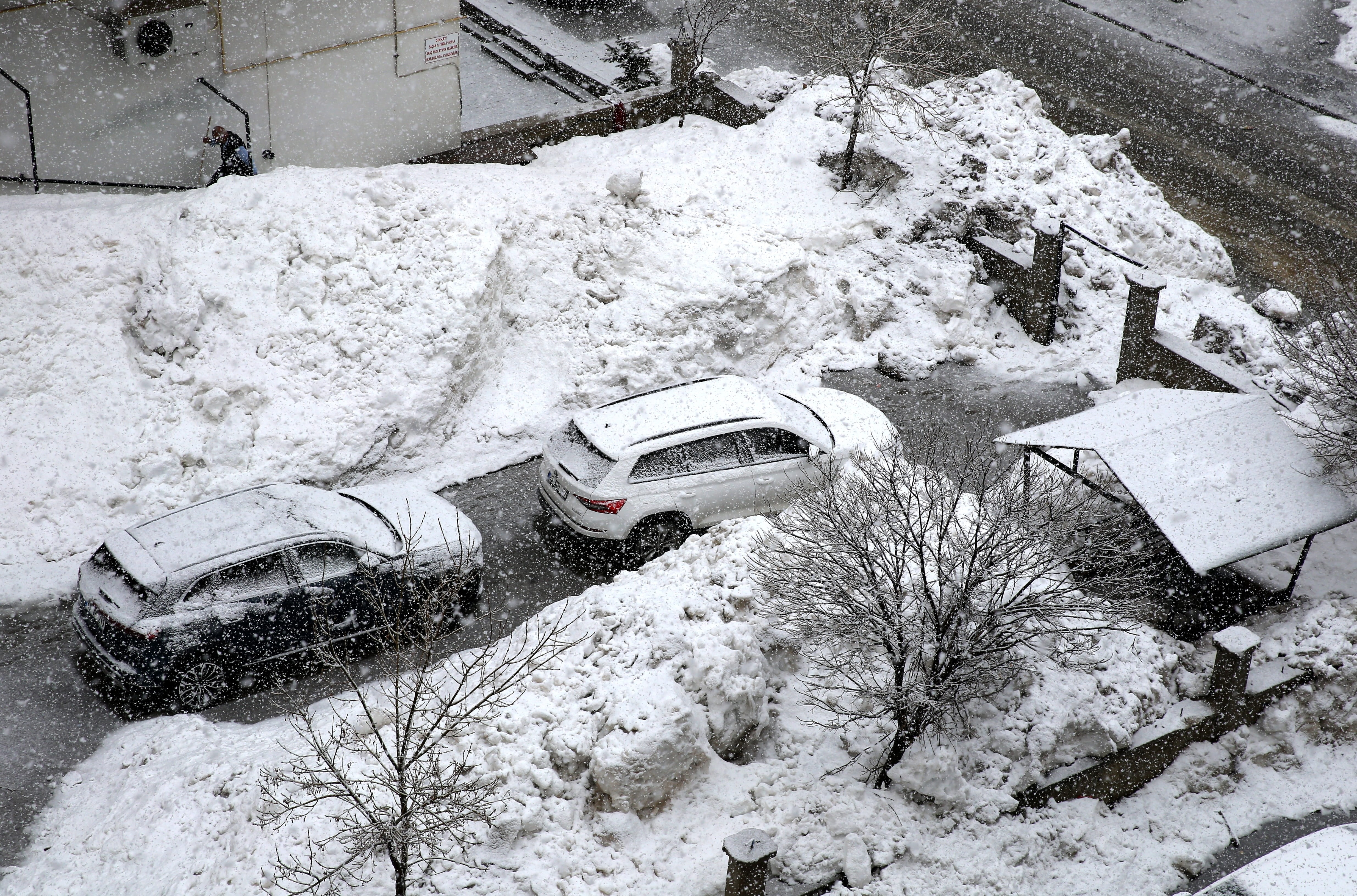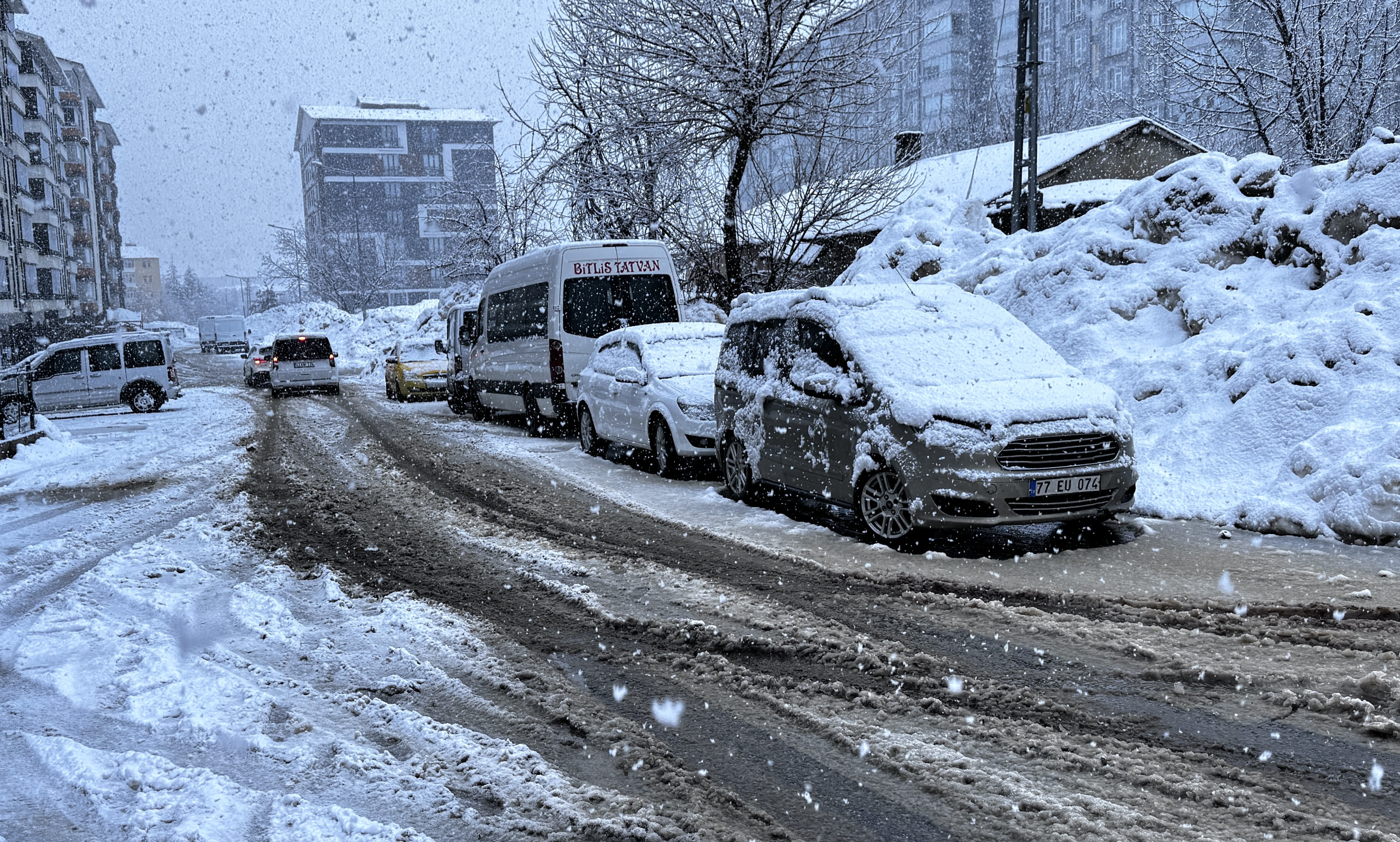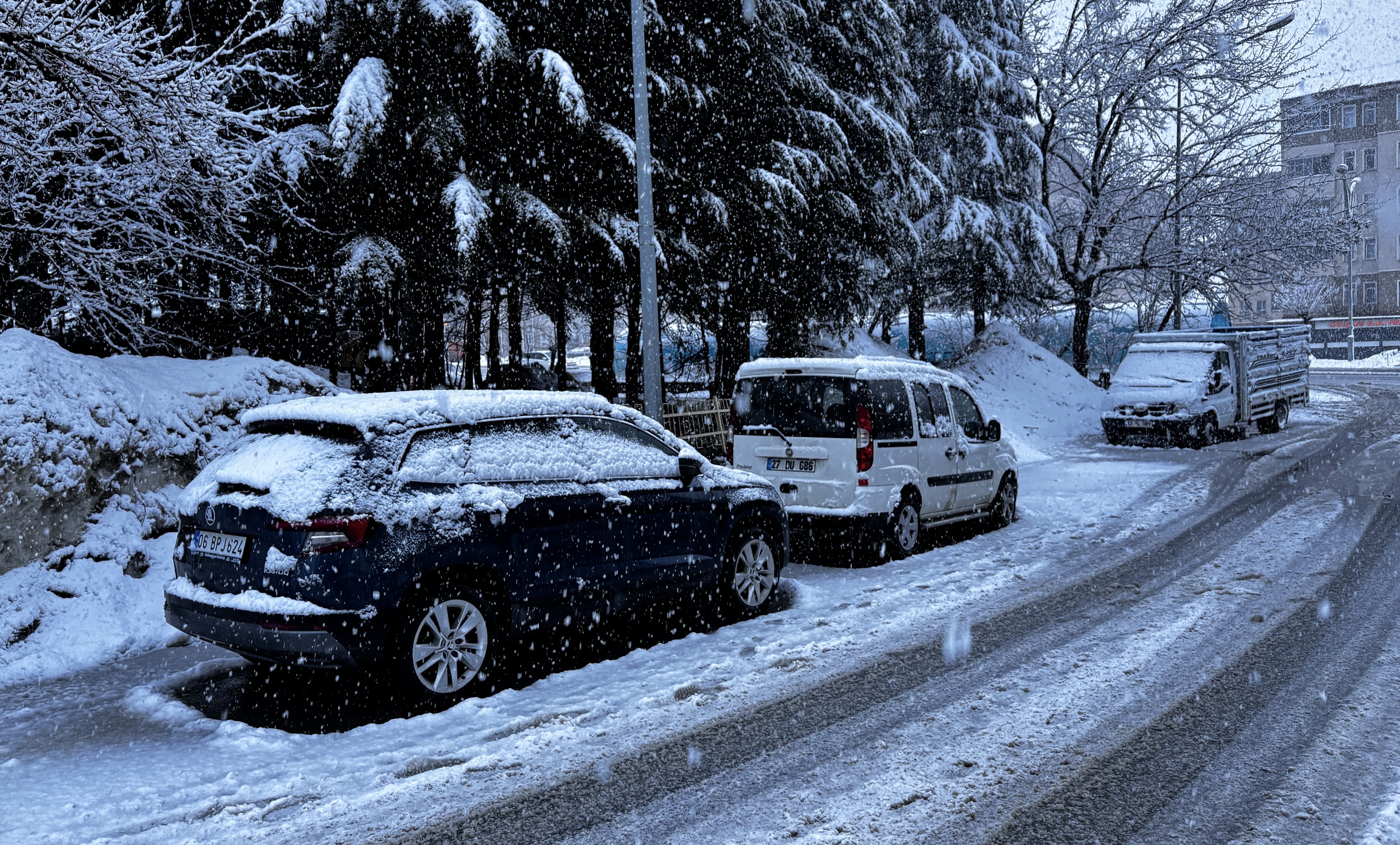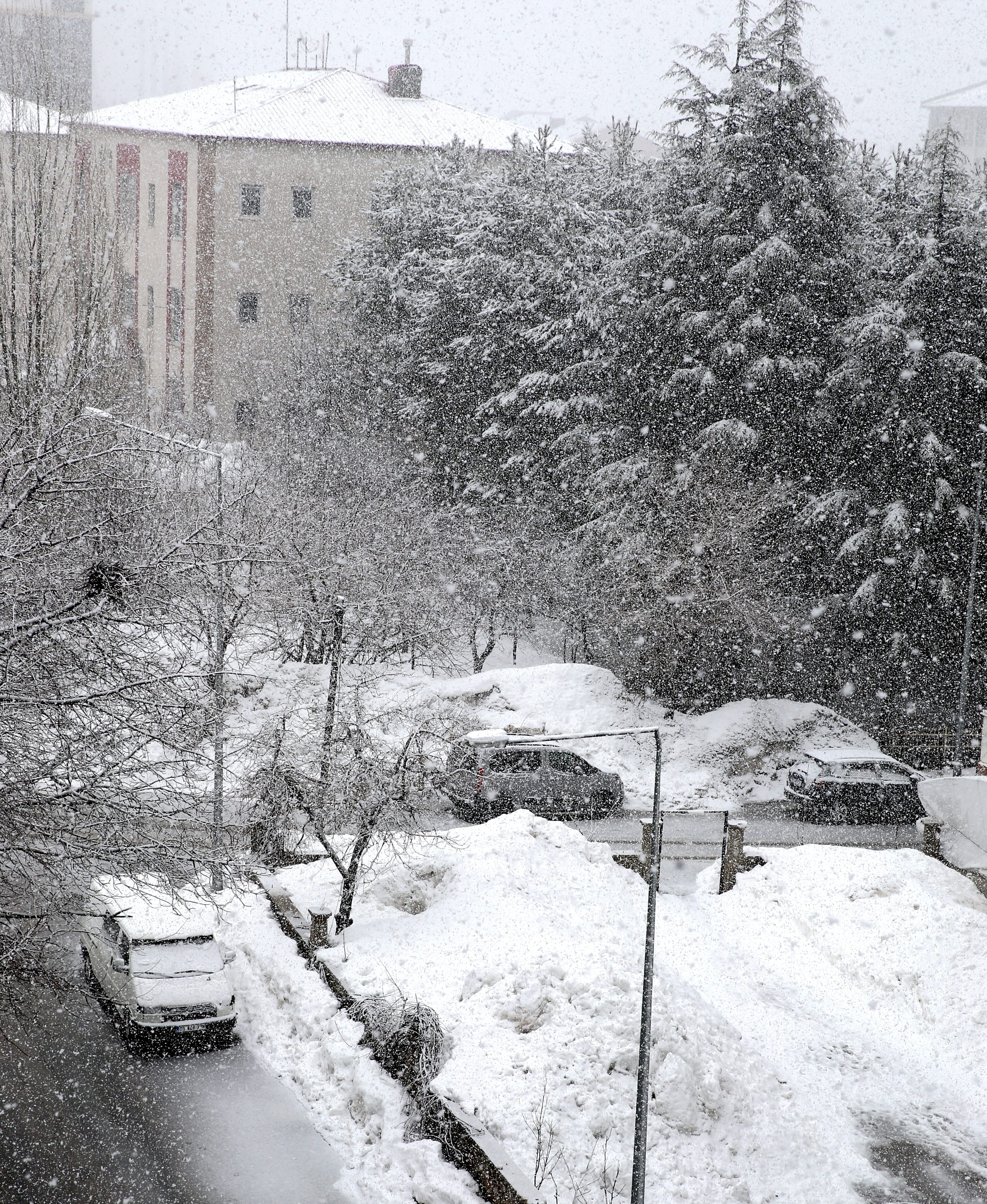 Kar nedeniyle kent merkezi beyaza büründü, araç ve ağaçların üzerinde kar birikti.
