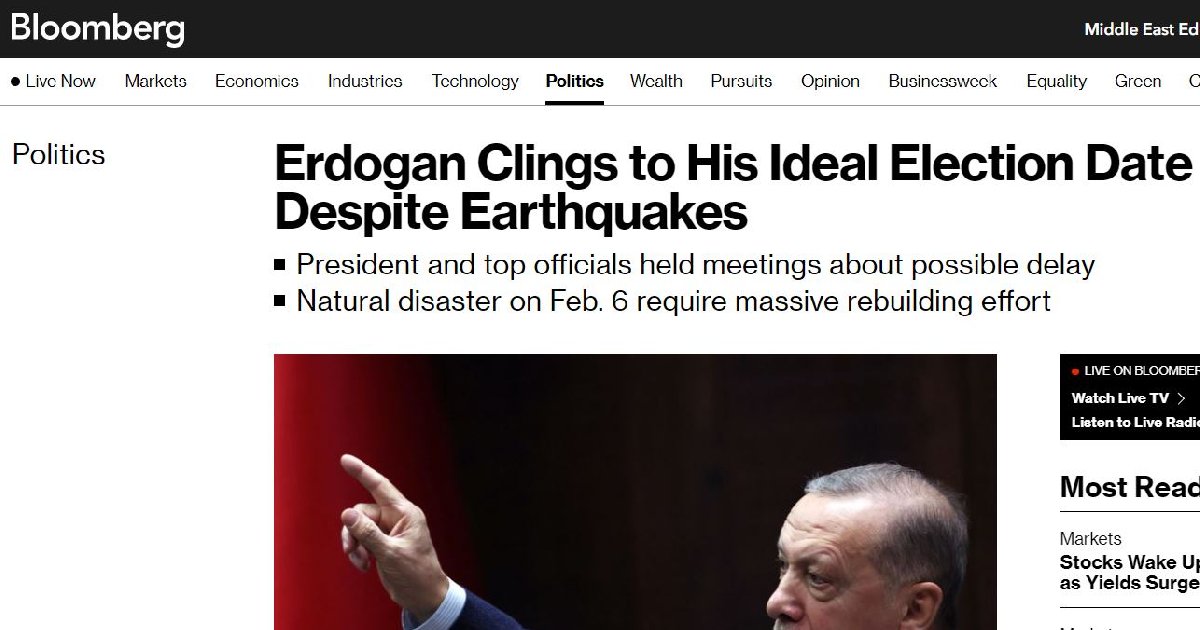 Seçimlerin ertelenip ertelenmeyeceğine dair resmi bir açıklama yapılmazken ABD'nin önde gelen medya kuruluşlarından Bloomberg dikkat çekici bir haber yayınladı. Bloomberg'deki haberde, "Erdoğan depremlere rağmen istediği seçim tarihinde ısrarcı" başlığını kullanırken Cumhurbaşkanı Erdoğan ve kurmaylarının seçimin ertelenmesi ile ilgili görüşme yaptığını aktardı.