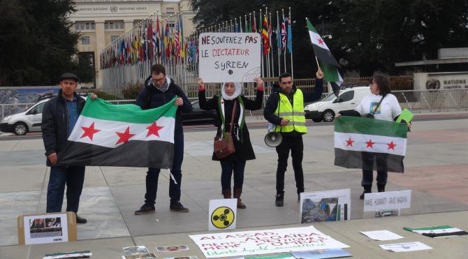 İsviçre’nin Cenevre kentinde BM sözcüsü Staffan de Mistura’nın açıklaması öncesinde, meydanda bulunan üç ayaklı iskemle heykeli etrafında toplanan bir grup Suriye yönetimini ve Beşar Esad’ı protesto etti. Sayıları 20’yi bulan protestocular ellerindeki pankartlarla “Suriye Diktatörüne İnanmayın”, “Al-Esad Al-Kaide aynı yöntem, aynı kavga” sloganları attılar. Esad’ın Hitlere benzeyen bir resmini de protestoda sergileyen grup, 18.30’a kadar meydanda protestolarına devam etti. Grup daha sonra olaysız dağıldı.