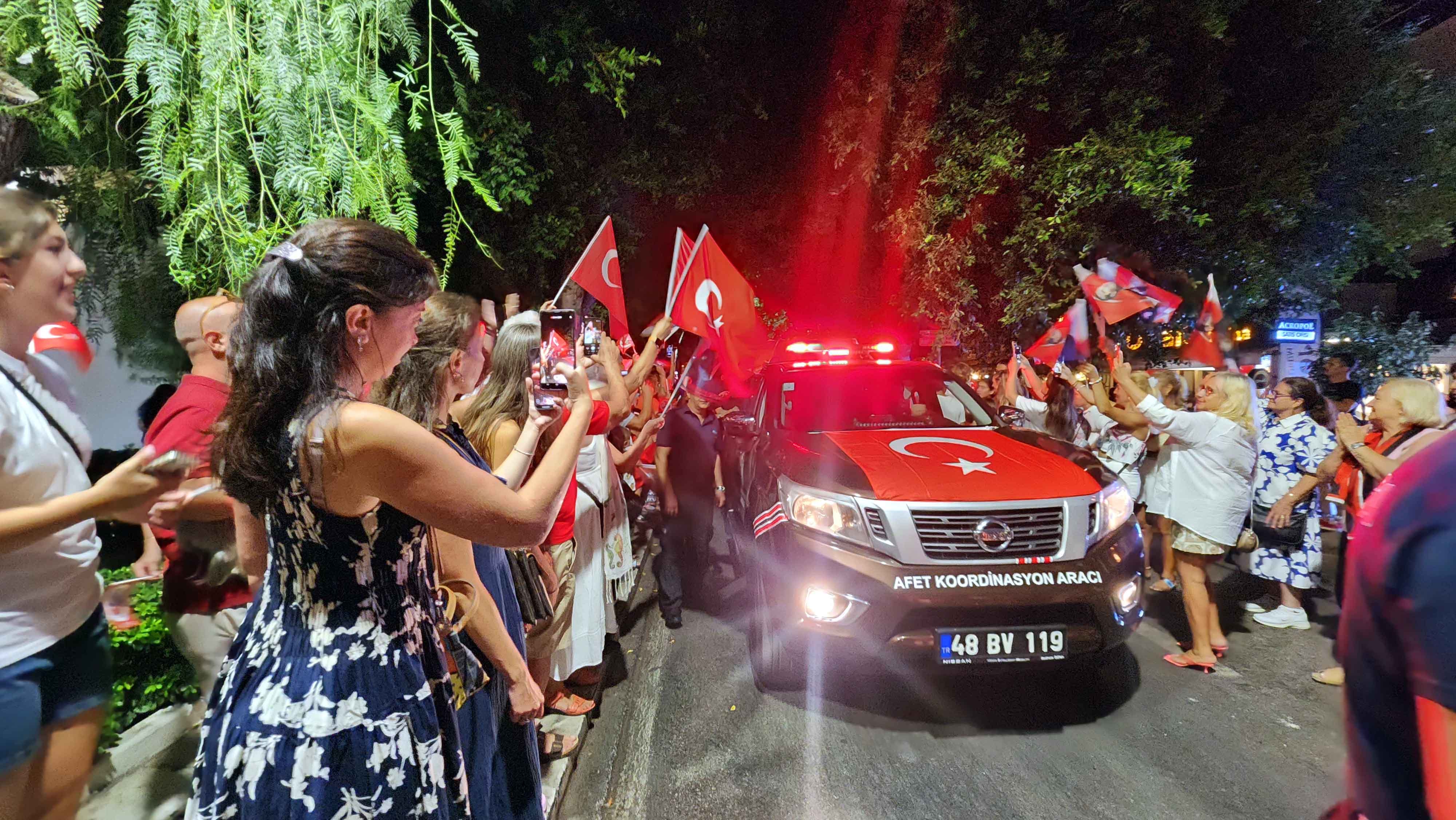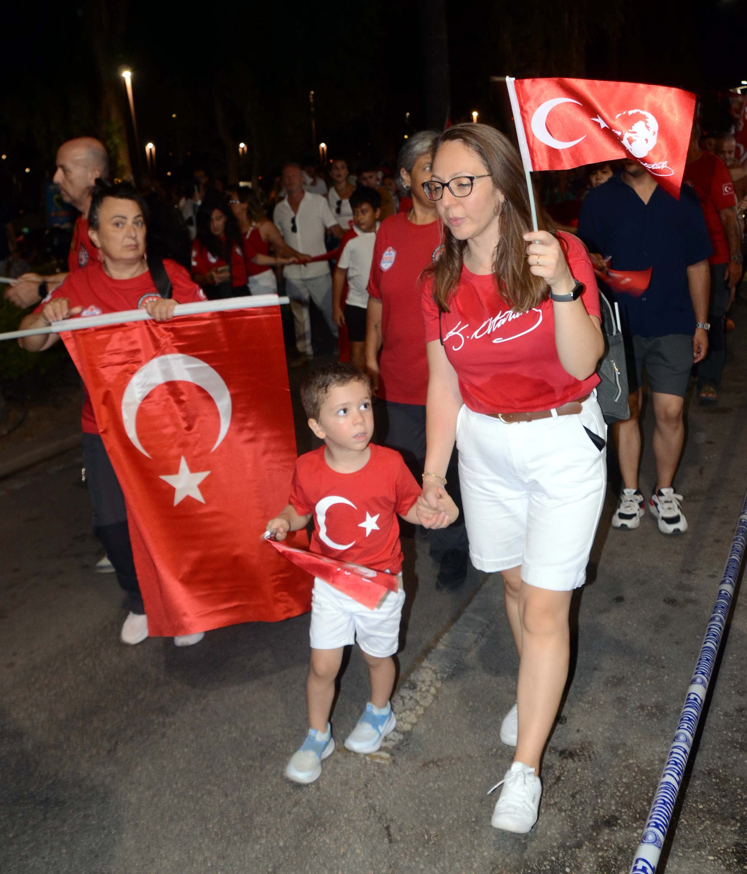 10. Yıl Marşı ile başlayan yürüyüşte sık sık Mustafa Kemal’in Askerleriyiz, Ne Mutlu Türküm Diyene, Vatan Canım Sana Feda, Millet Ordu Elele sloganları atıldı. Fener alayına Neyzen Tevfik Caddesi’ndeki bar ve diskolarda çaldıkları 10. Yıl Marşları ile destek verdi. İlçede bulunan yabancı turistler yürüyüşe katılanları alkış yağmuruna tuttu. Bol bol fotoğraf çekti. Feenr alayında altı aylık Emircan Beyazıt bebek ile 102 yaşındaki Fatma Çakır nineye kadar binlerce kişi fener alayında coşku ile yürüdü.