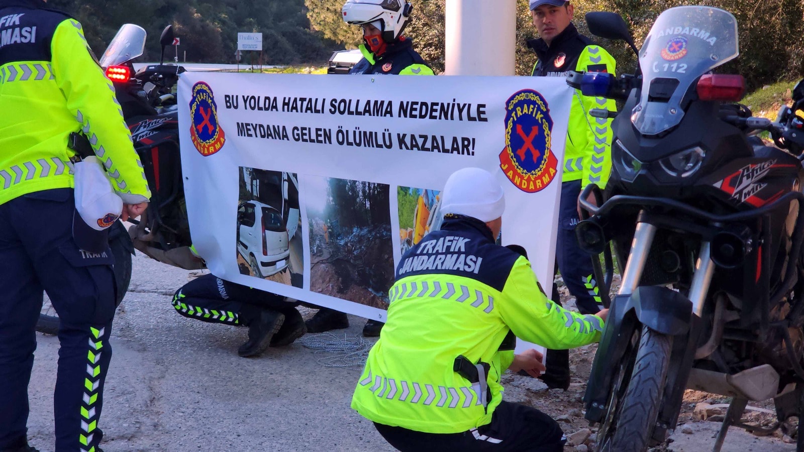 Hatalı sollama nedeniyle aynı noktada 3 ölümlü kazanın meydana geldiği yerde “BU YILDA HATALI SOLLAMA NEDENİYLE MEYDANA GELEN ÖLÜMLÜ KAZALAR” yazılı ve üç ölümlü kazanın fotoğraflarının yer aldığı pankartı açıp sürücüleri durdurduktan sonra bilgilendirme açıklamaları yaptı.