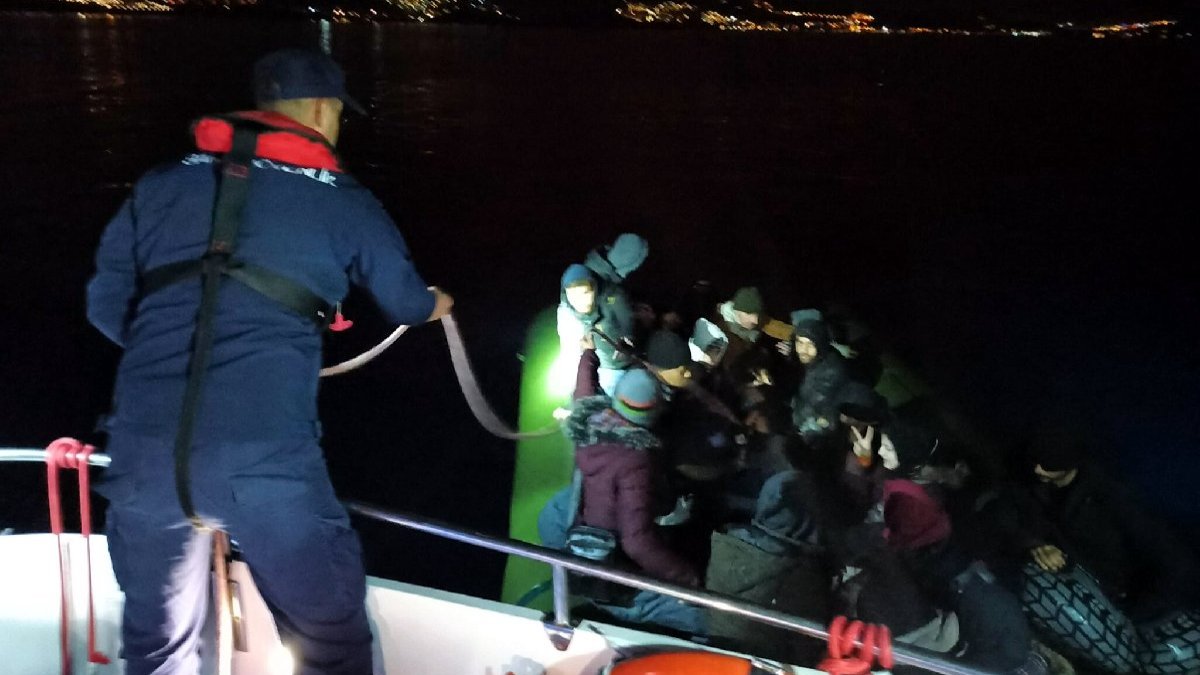 Bölgeye ulaşan ekipler, 29 kaçak göçmeni kurtardı. Kıyıya çıkarılan göçmenler, İl Göç İdaresi Müdürlüğü'ne teslim edildi. (DHA)