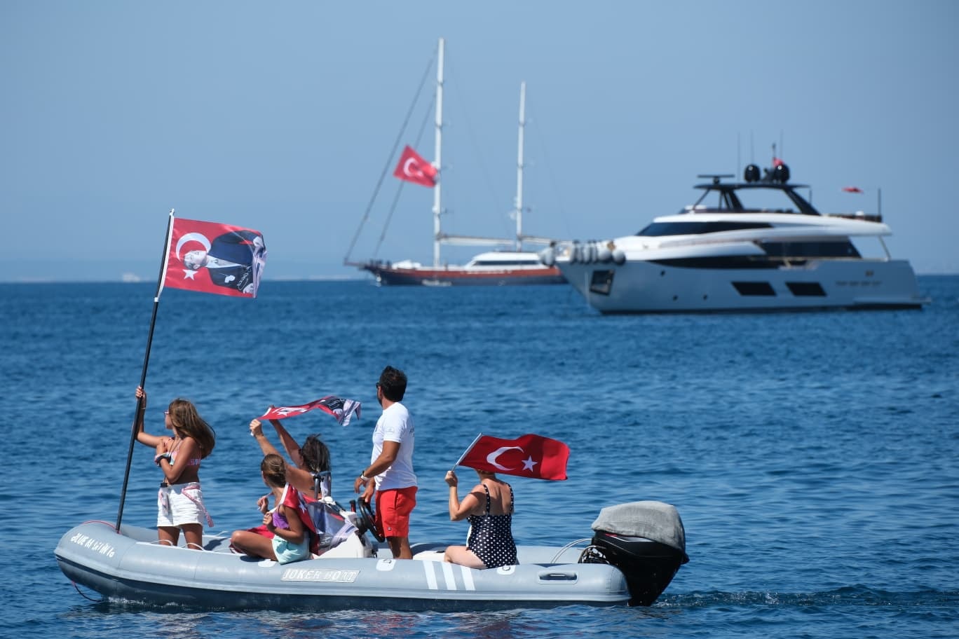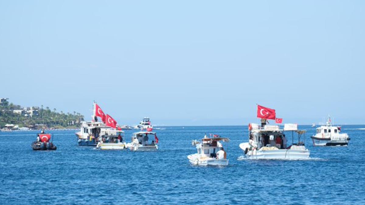 Denizde 40’ı aşkın teknede yüzlerce kişi ellerinde Atatürk ve Türk bayrakları ve teknelerle korteje katıldı. Denizdeki korteje karadaki vatandaşlar alkışlar ve korna sesleri ile destek verdi.