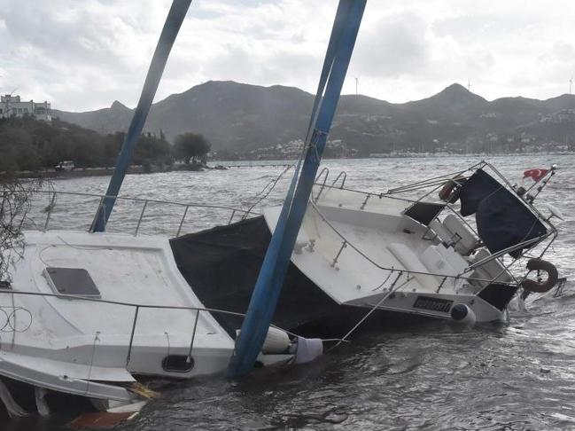 Muğla'nın Bodrum ilçesinde etkili olan fırtına nedeniyle demir atan bir tekne sürüklenerek karaya oturdu. Denizde oluşan dev dalgaların aşındırdığı iskeleler de yerinden söküldü.