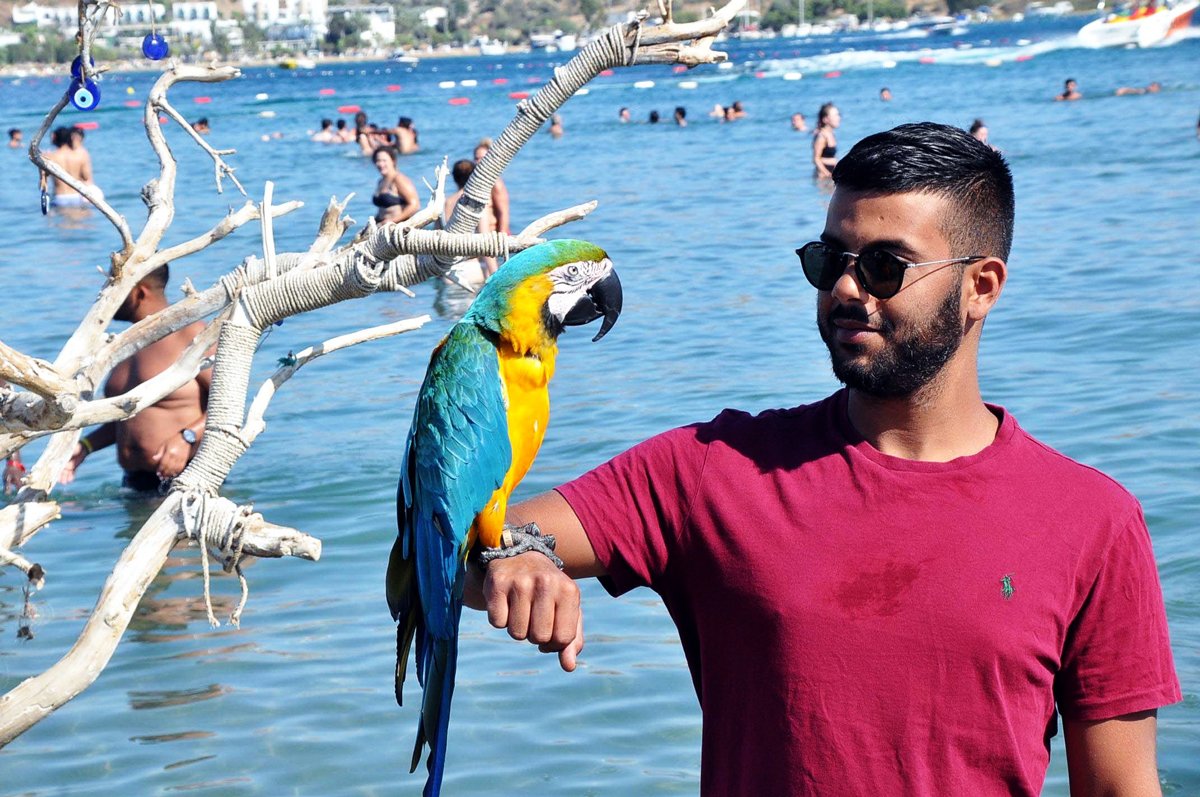 Gümbet sahilindeki bir beach clubın önünde duran Alora isimli Afrika kökenli papağan turistlerin ilgi odağı oldu. Turistlerin bol bol hatıra fotoğrafı çektirdiği papağanın insanlara olan alışkanlığı dikkat çekti.