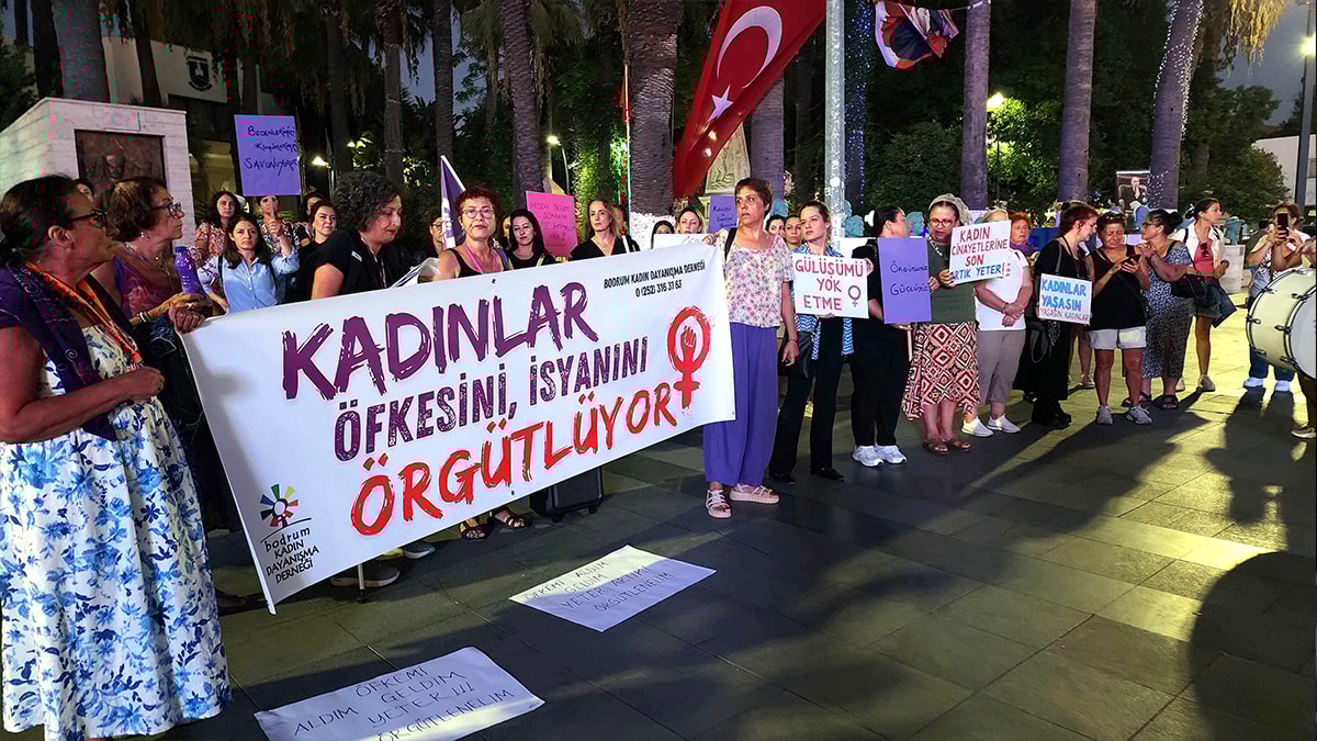 Bodrum Kadın Dayanışma Derneği tarafından Belediye Meydanı’nda düzenlenen eylem ve basın açıklamasına yaklaşık 100 kadın katıldı. Ellerinde "Öfkemi Aldımm Geldim Artık Yeter Örgütlenelim", "Öfkeni Diri Başını Dik Tut", "Kadın Cinayetlerine Son", "Kadınlar Öfkesini İsyanını Örgütlüyor", "Tedirgin Ettirdiğiniz Her Kadının Hesabını Soracağız" yazılı dövizler ve "Kadınlar Öfkesini İsyanını Örgütlüyor" yazılı pankart ile meydana gelen kadınlar sık sık ellerindeki davul, zil ve düdüklerle seslerini yükselterek kadına yönelik şiddeti protesto etti.