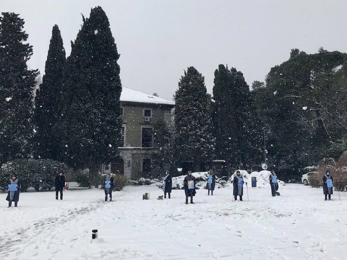Boğaziçi Üniversitesi Güney Kampüsü’nde yoğun kar altında gerçekleşen eylemde akademisyenler, cübbeleriyle rektörlük binasına sırtlarını döndü. Akademisyenler, eylemlerinde “Vazgeçmiyoruz, kabul etmiyoruz” yazılı dövizler taşıdı.