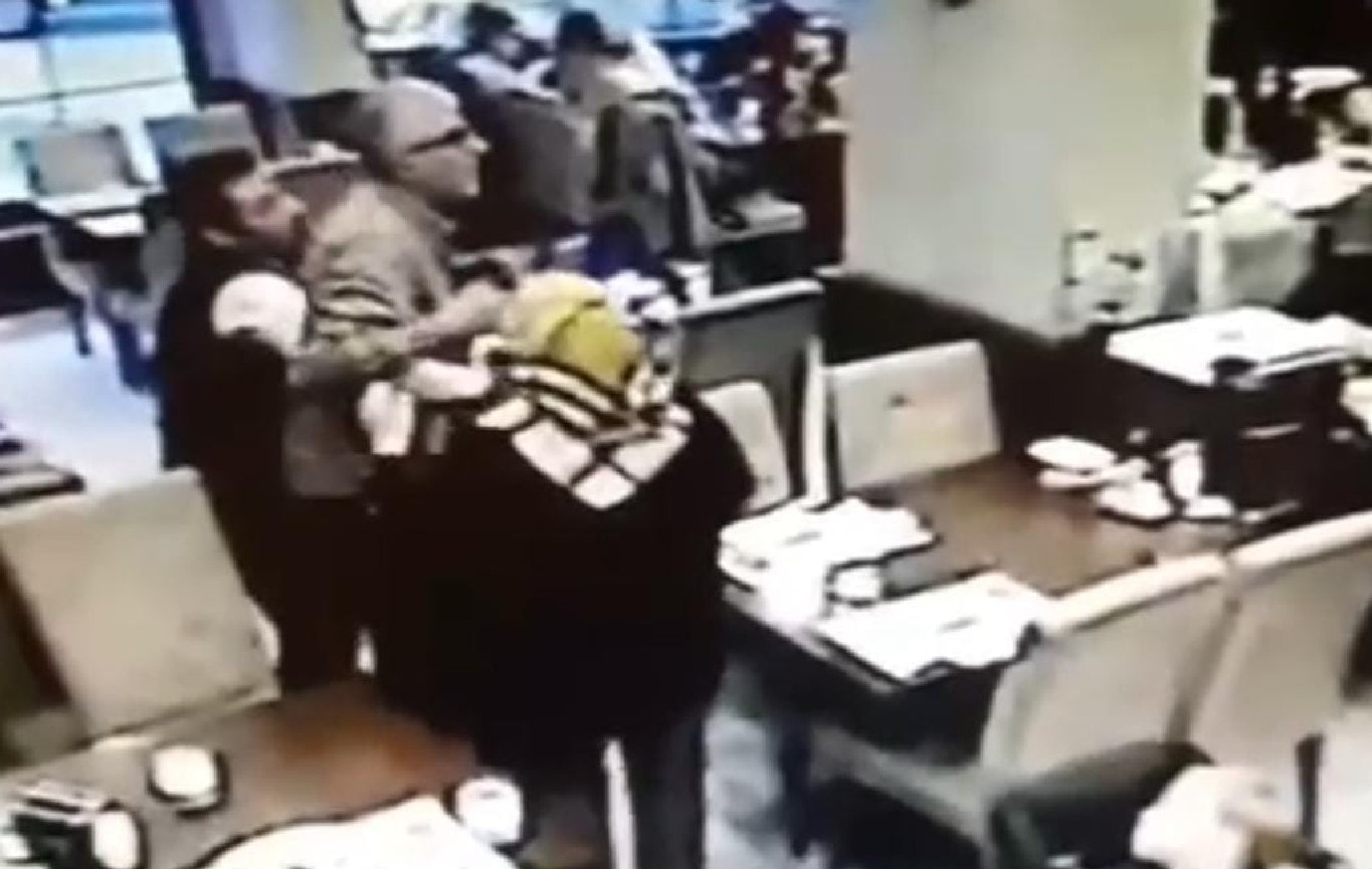 Garson, 'heimlich' manevrasıyla müşteriyi kurtardı. Güvenlik kamerasına yansıyan olayda garsonun müdahalesiyle müşterinin rahatladığı görüldü.