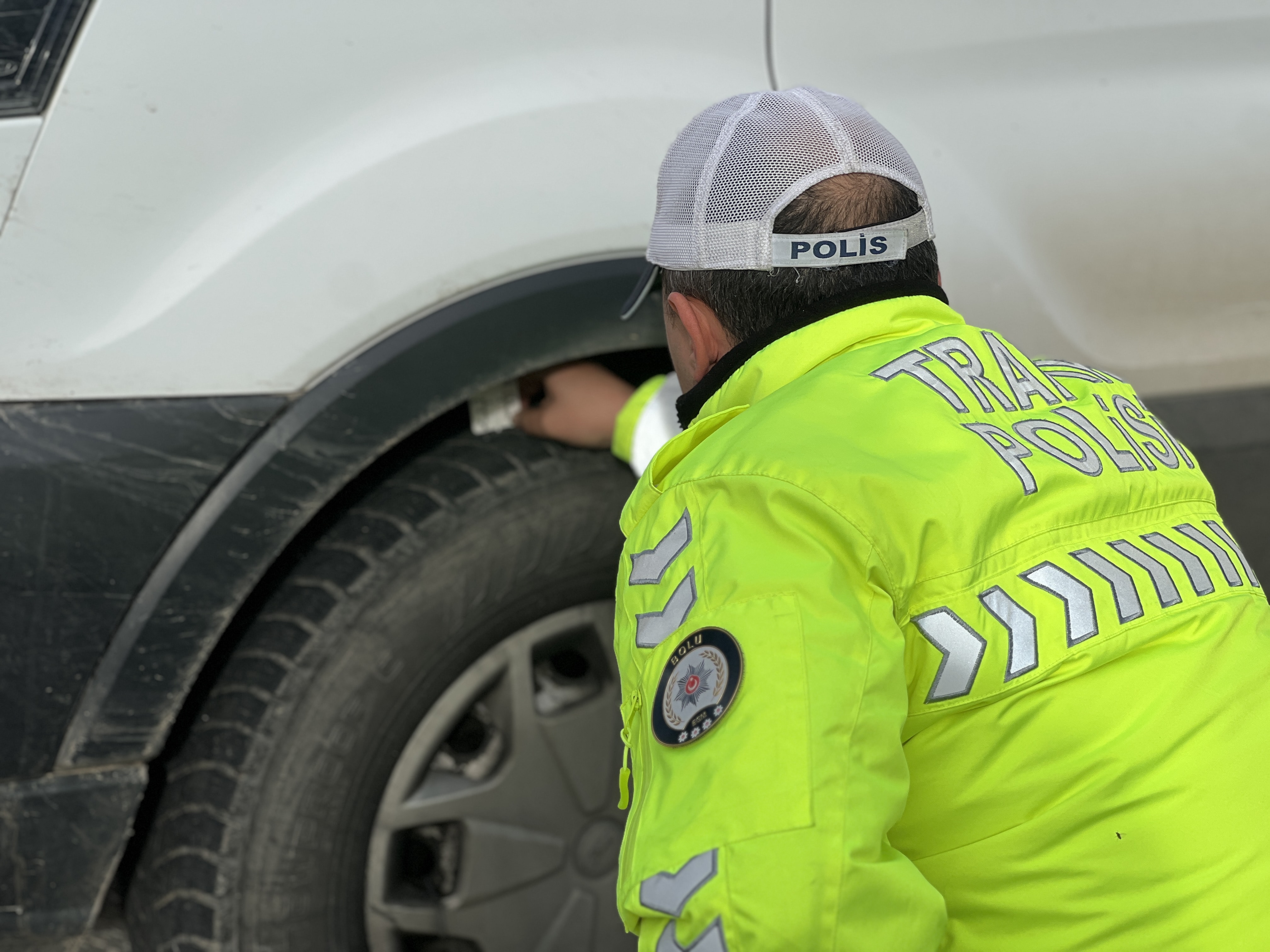 D-100 kara yolunun Bolu Dağı geçişinde ekipler, hafif ticari araç, kamyon, tır ve yolcu otobüslerin kış lastiklerini kontrol etti.