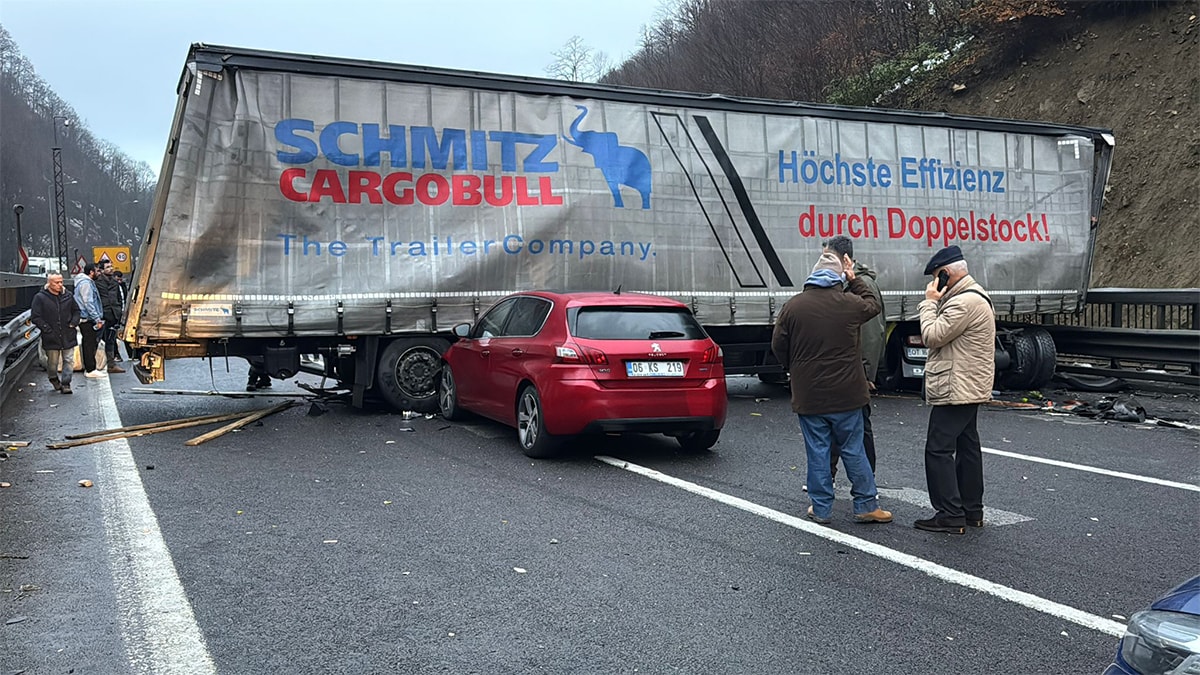 Romanya uyruklu şoförün kullandığı OT 16 YKW plakalı tır, Anadolu Otoyolu'nun İstanbul istikameti Bolu Dağı Tüneli çıkışı 3. viyadük üzerinde sürücünün direksiyon hakimiyetini kaybetmesi sonucu makasladı.