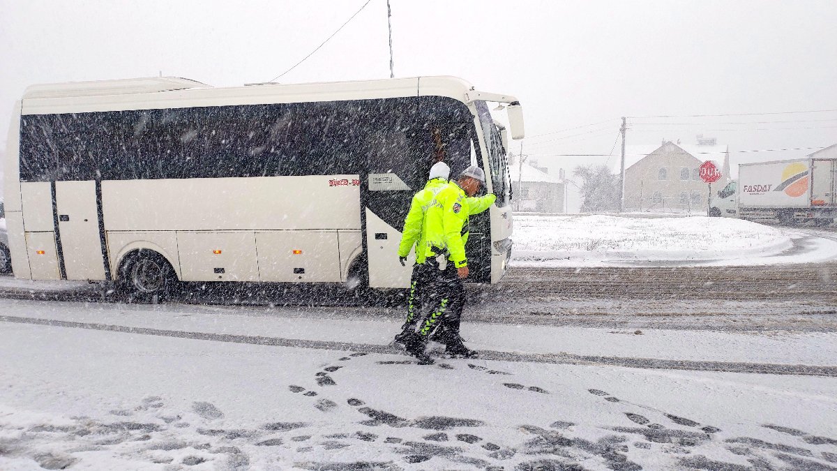 Güzergahta ulaşım kontrollü şekilde sağlanırken, bölgede kar yağışı devam ediyor. (DHA)