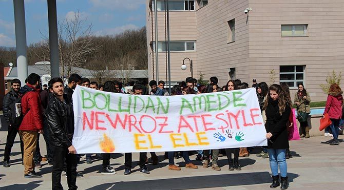 Çok sayıda polis ekibi TOMA ile önlem aldı. Öğrenciler, 'Bolu'dan Amed'e newroz ateşiyle el ele' yazılı pankart açarak kürtçe sloganlar atmaya başladı. AİBÜ Genel Sekreteri Erdal Bekiroğlu, izinsiz gösteri yaptıklarını söyleyerek örencilere dağılmalarını istedi. Ancak öğrenciler halaylar çekmeye devam etti.