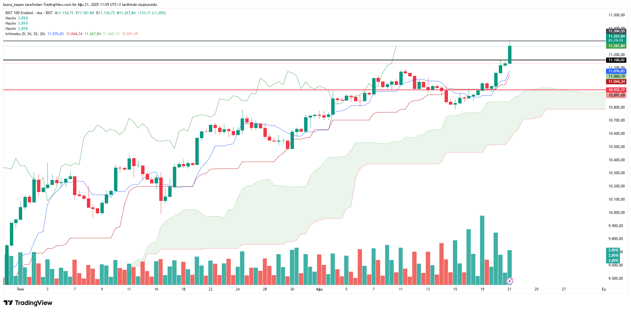 Borsa İstanbul'da BİST 100 endeksi tarihi zirvesini gördü. Dünü 10 bin 932 puan ile 11 bin 160 puan aralığına geçiren Borsa İstanbul, dünü 11 bin 133 puandan tamamladı. BİST 100 endeksi bugün sert yükselişler sergileyerek 11 bin 259 puana çıkarak 13 ay sonra yeni tarihi zirvesini gördü.